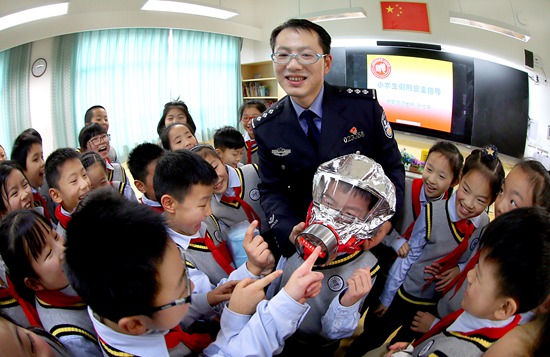 1月17日,上海市公安局徐汇分局湖南路派出所民警张仁乐在指导徐汇区第一中心小学学生正确佩戴消防自救呼吸器。当日,该派出所的民警们深入辖区中小学校,为学生讲解常见的救生知识,提高自我保护意识,让学生们过一个快乐、平安的寒假。新华社记者 凡军/摄